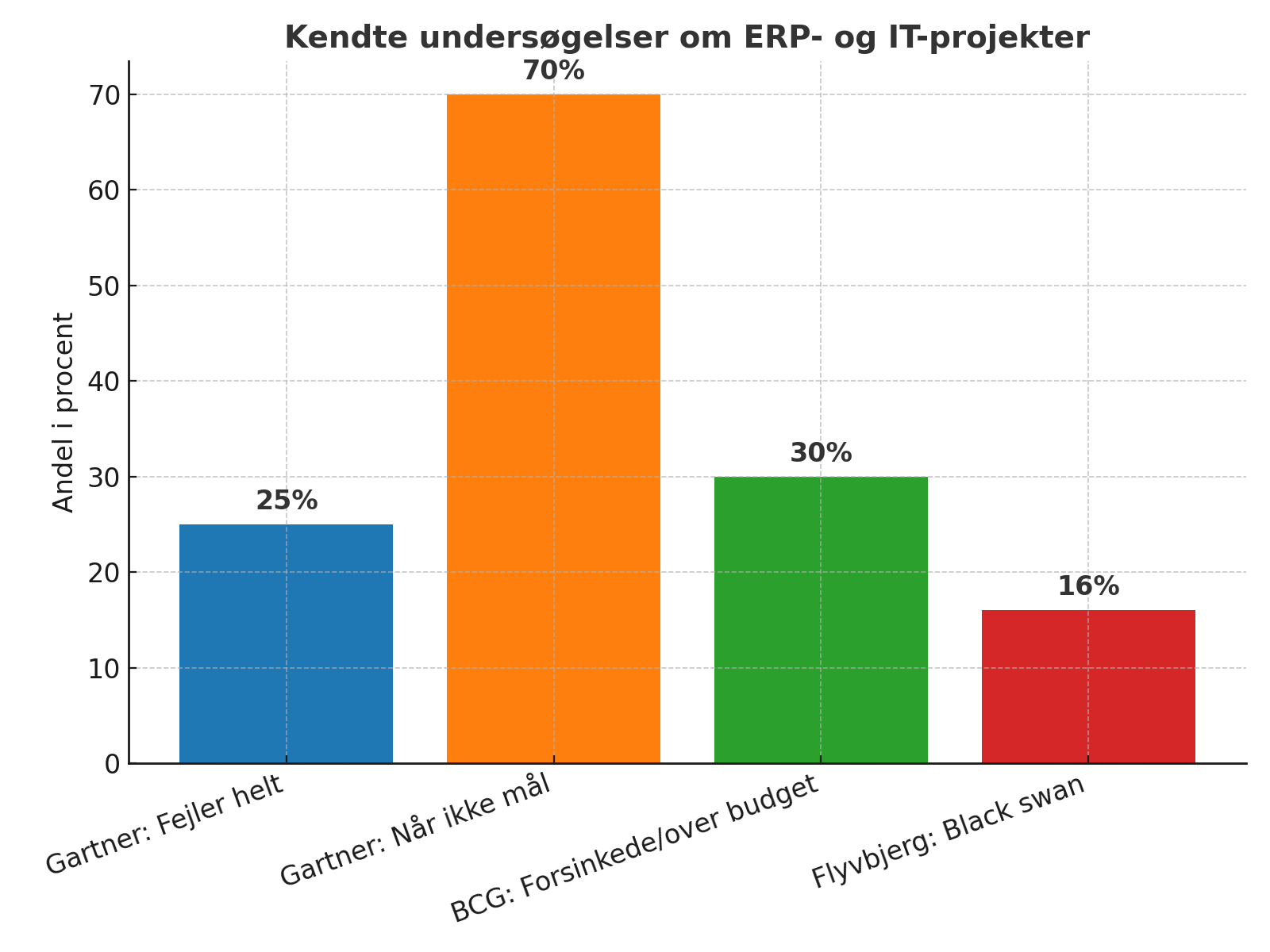 Boston Consulting Group (BCG): "Over 30 % af større IT-projekter (inkl. ERP) er både forsinkede og dyrere end planlagt." Kilde: BCG – Software Projects Don't Have to Be Late, Costly, and Irrelevant